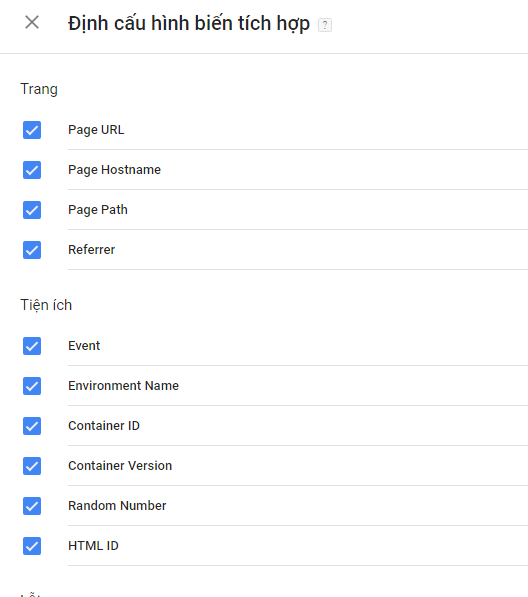 Bước 1: Trong GTM / biến / định cấu hình biến / mở hết các chức năng